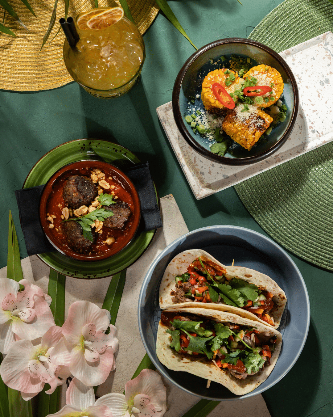 tacos z szarpanym karkiem wołowym / salsa ze świeżych warzyw / sos chipotle / szczypiorek / kolendra – 32,-