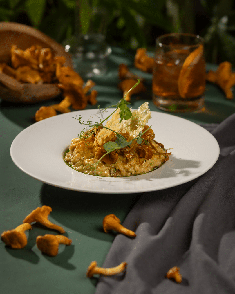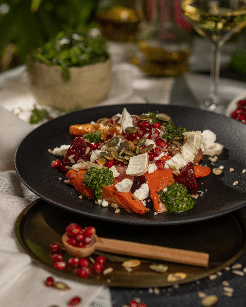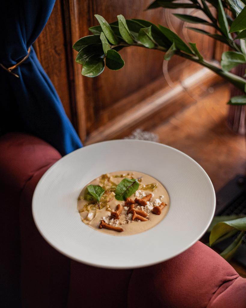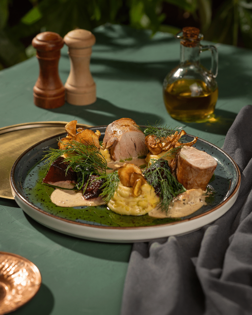 puree ziemniaczane z prażoną cebulą / sos borowikowy / pieczone buraki z czosnkiem i szpinakiem / chips z topinamburu / oliwa rozmarynowa (bezglutenowe)