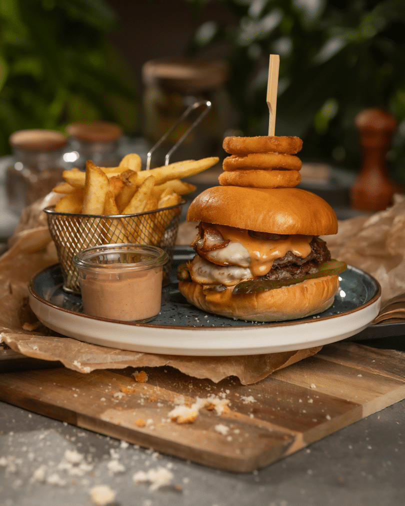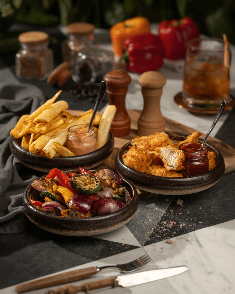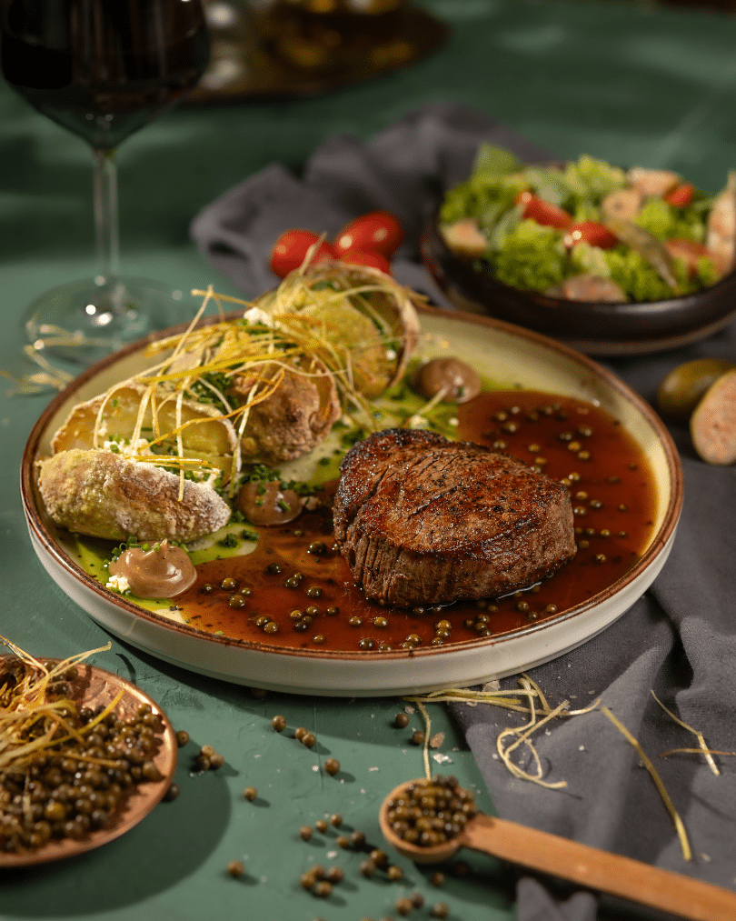 ziemniaki pieczone w soli / sos wołowy z zielonym pieprzem / wędzony twaróg / szczypiorek / majonez z czarnego czosnku / oliwa rozmarynowa / chips z pora / mix salat z dressingiem miodowo – tymiankowym (bezglutenowe)