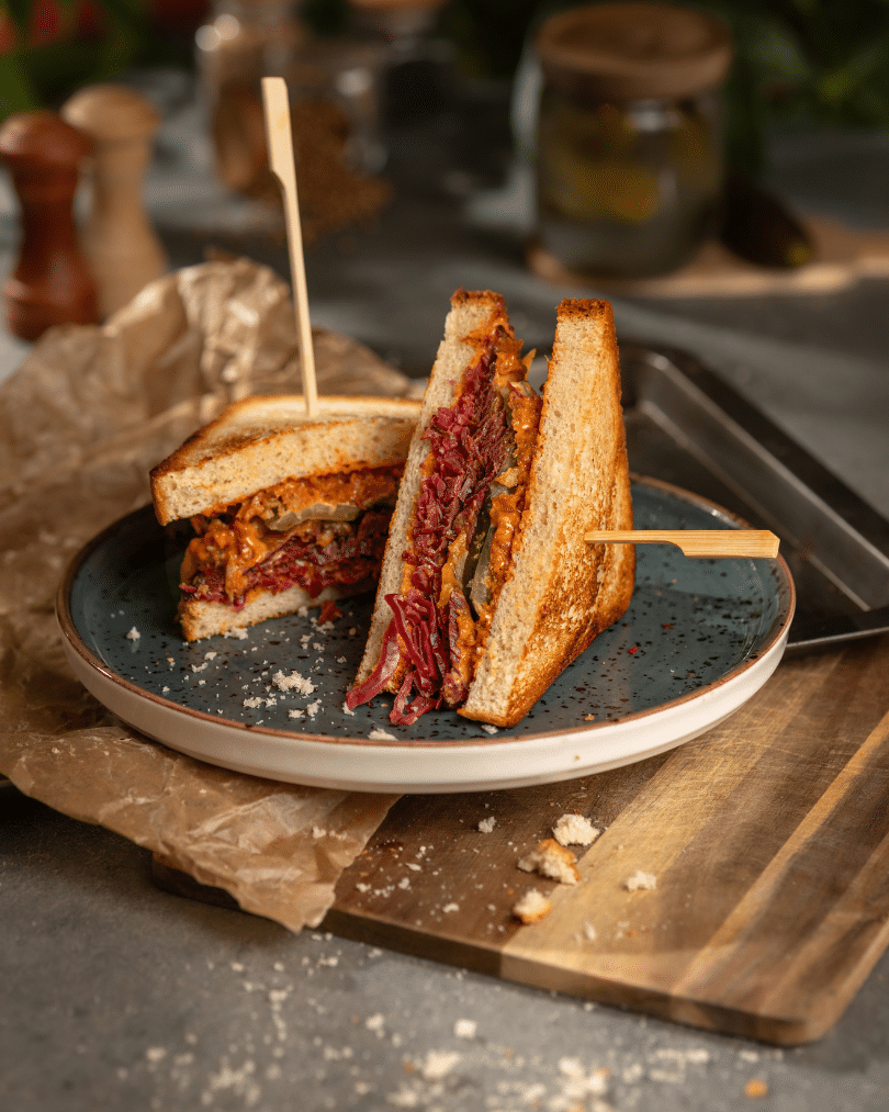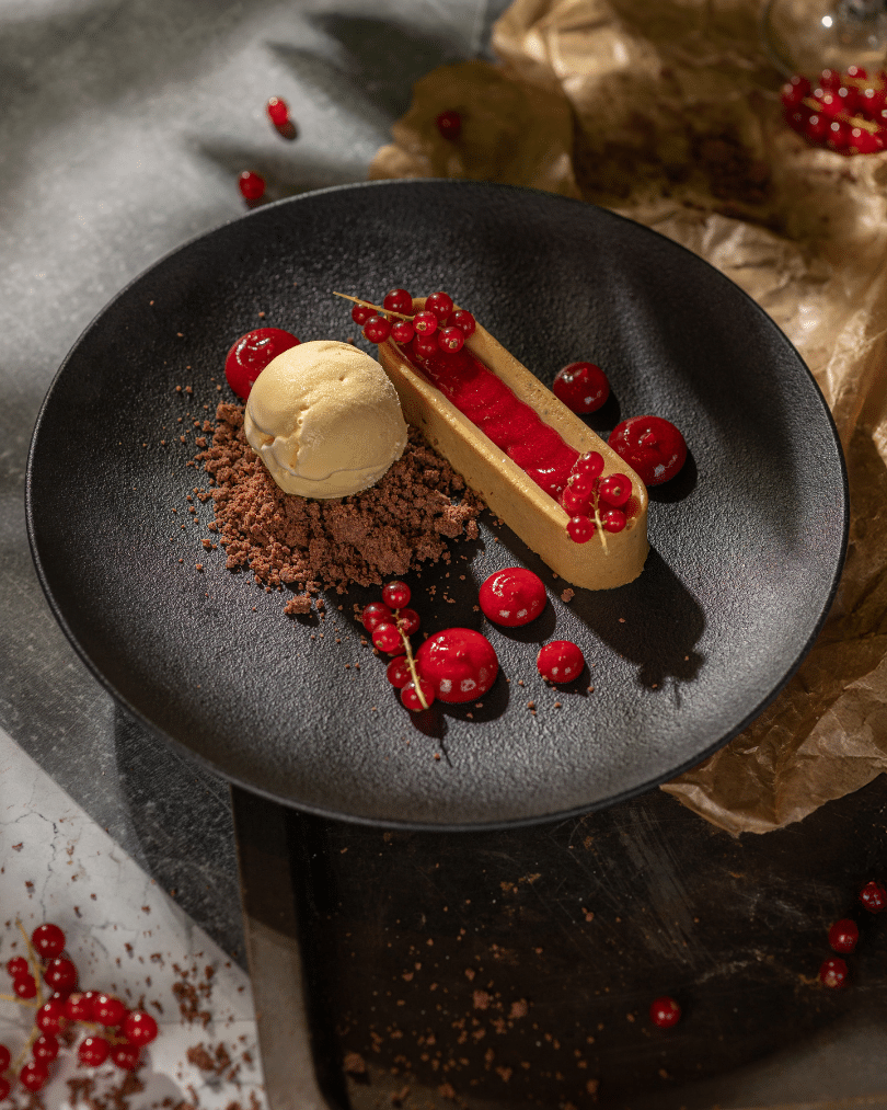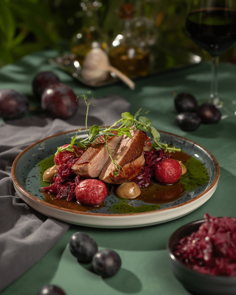 gnocchi buraczkowe z mascarpone i orzechami / sos wołowy z wędzoną śliwką / zasmażana czerwona kapusta / majonez z czarnego czosnku / oliwa rozmarynowa